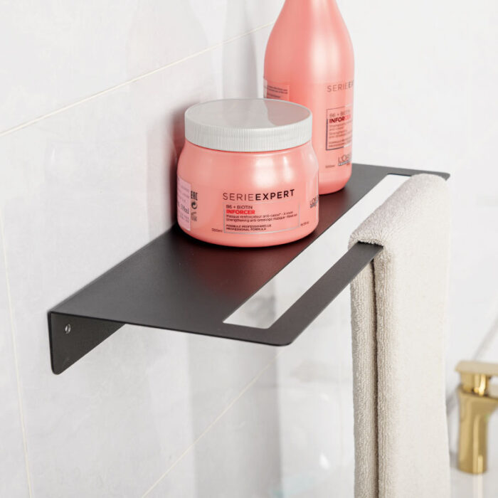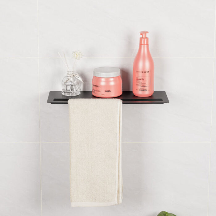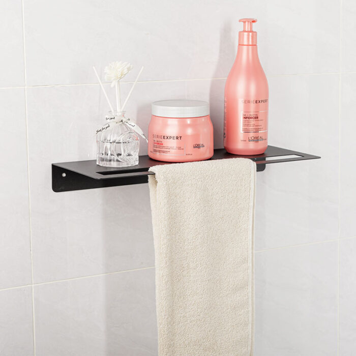 The bathroom wall towel holder and storage shelves is crafted from a single piece of high-quality metal. This innovative piece combines functionality with a sleek aesthetic, making it an ideal addition to any modern bathroom.