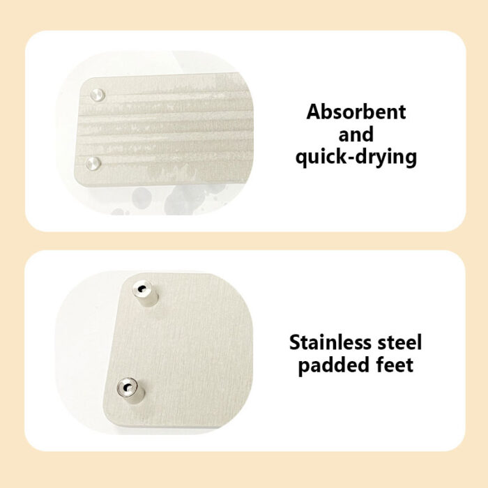 The diatom mud bath tray is ingeniously constructed with a diatom mud panel that boasts a built-in drainage channel. This channel effectively manages water flow and prevents pooling, keeping your surfaces clean and dry. Additionally, the tray comes with four sturdy stainless steel feet that elevate it from the ground, further enhancing its moisture-resistant properties. This unique product is designed to absorb water efficiently and dry quickly, making it ideal for use in high-moisture areas like bathrooms and kitchens.