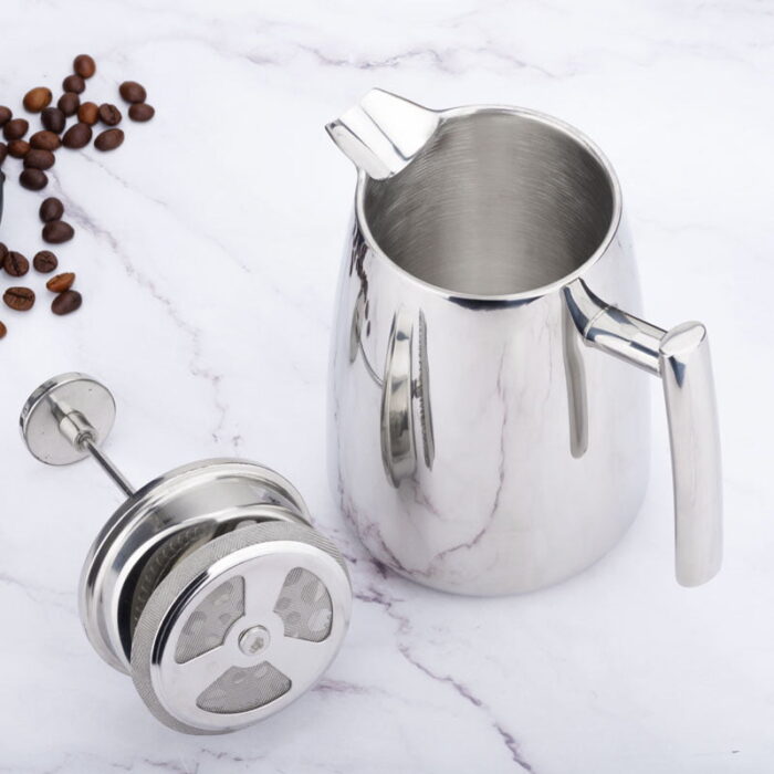 Stainless steel French press pot has a 3-layer filter structure with an ultra-fine stainless steel mesh strainer. You can use it to make tea and brew coffee without worrying about the tea or coffee powder mixing together and affecting the taste.