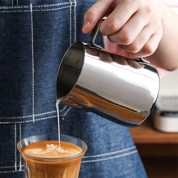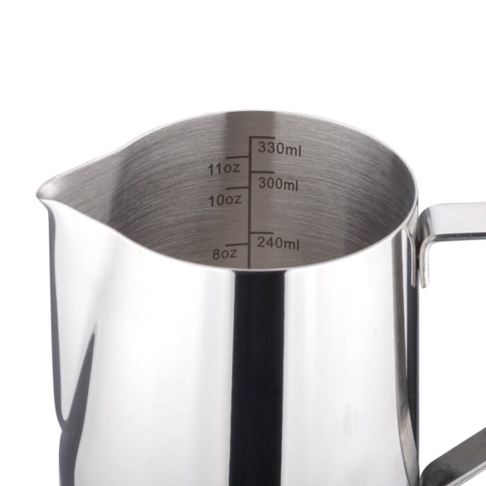 Measurement inside makes it easy to read and help to control how much milk or cream each cup of coffee or espresso.Hand-held frothing milk pitcher prevents you from being scalded. Round stainless steel bottom makes it easy to wash without stain to hide.