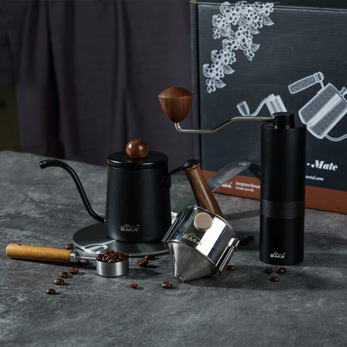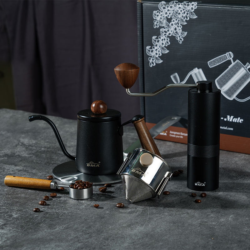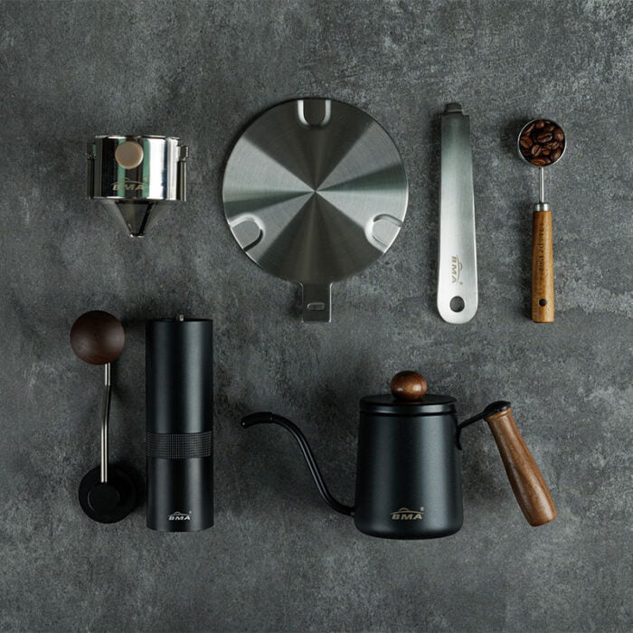 This bma outdoor coffee set contains a manual grinder, stainless steel coffee filters (no filters needed), coffee kettle, coffee scoop and a heat diffuser plate for boiling water. It can meet your outdoor coffee needs.