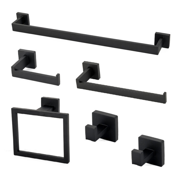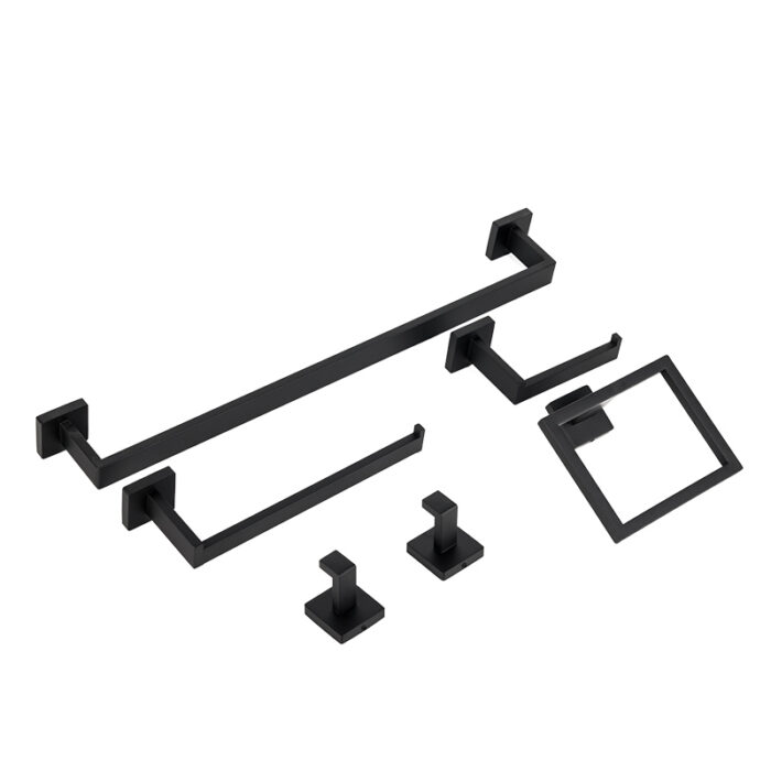 6 Pieces Bathroom Hardware Set Combination – 1 x Towel Bar (L), 1 x Towel Bar (S), 1 x Toilet paper holder, 2 x hook, 1 x square towel ring.